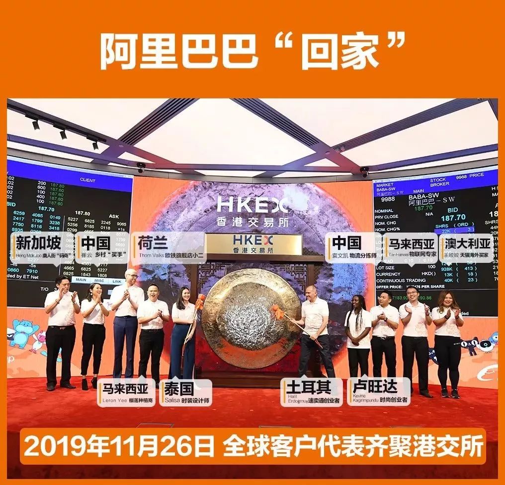 11月26日9点30分,阿里巴巴集团在香港交易所鸣锣上市,开盘价187港元,较发行价大涨6.25%,阿里巴巴集团成为首个同时在美股和港股两地上市的中国互联网公司。