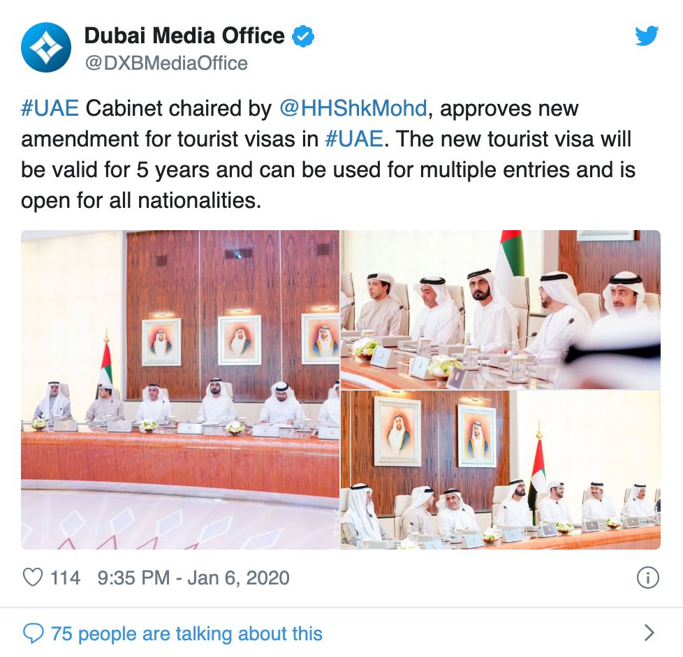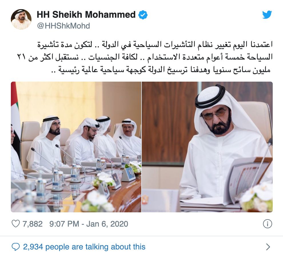 1月6日,阿联酋副总统兼总理兼迪拜酋长谢赫·穆罕默德·本·拉希德·阿勒马克图姆在推特上宣布了新的旅游签证制度。
