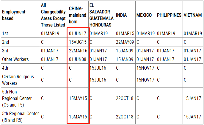 从上述表格看出,亲属移民类部分原地踏步,但表B几乎都前进1个月以上,甚至4个月;而职业移民排期EB-1和EB-2小幅度前进几天,EB-3一改之前两个月原地踏步的情况,向前1个月,成为移民类前进幅度最大的类别。
