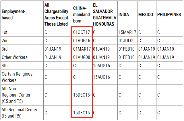 EB-1类别排期为2017年10月1日,前进1个月;