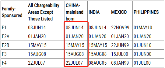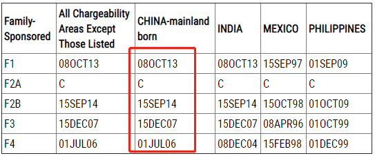 根据亲属移民排期表B,对于中国大陆出生的申请人来说: