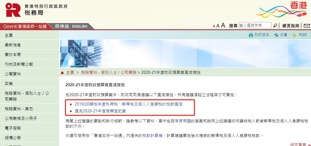 2019/20课税年度利得税、薪俸税及个人入息课税的税款宽减;