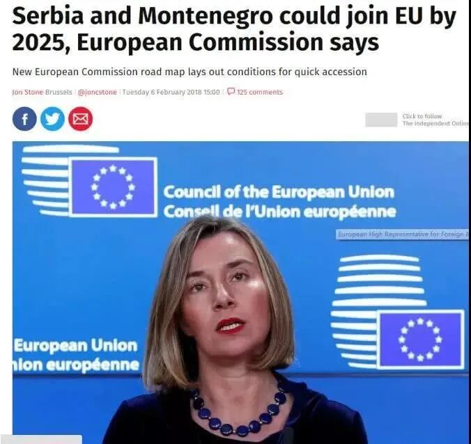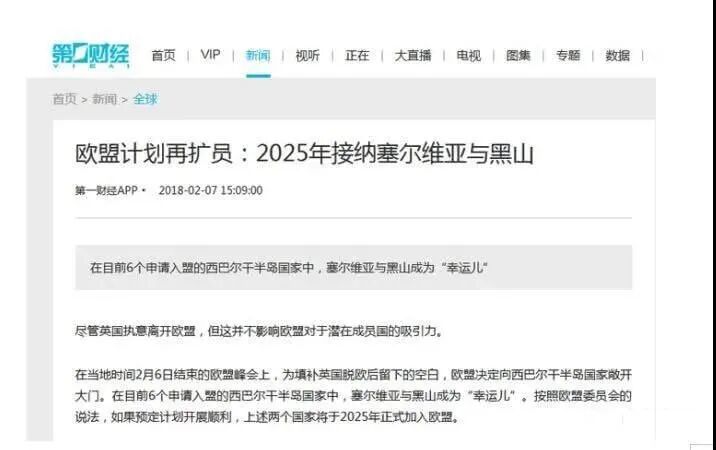 2018年2月6日,第一财经曾报道:在2018年2月6日结束的欧盟峰会上,为填补英国脱欧后留下的空白,欧盟决定向西巴尔干半岛国家敞开大门。在目前6个申请入盟的西巴尔干半岛国家中,黑山成为“幸运儿”。按照欧盟委员会的说法,如果预定计划开展顺利,上述两个国家将于2025年正式加入欧盟。