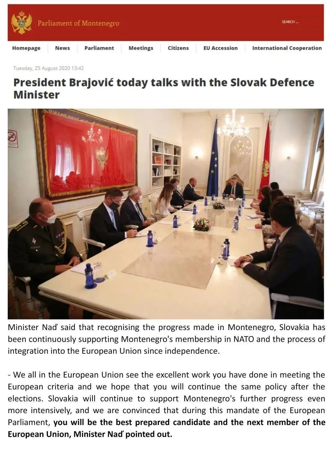 据黑山议会官网消息,近日,欧盟成员国斯洛伐克国防部长雅罗斯拉夫· 纳奇(Jaroslav Nadj)首次对黑山进行正式访问,在与黑山议会主席伊凡•布拉乔维奇的会谈中,Jaroslav Nadj表示:“在新的欧盟委员会任期内,至少有一个国家会加入欧盟,而黑山则是准备最充分的候选国,是最有机会成为欧盟的下一个成员!”