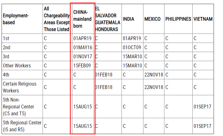 A表格为“移民签证的最后批准日期(移民排期)”(Application Final Action Dates ),就是绿卡可签发的日期,当表A日期前进到申请人的优先日期,申请人就可以拿到绿卡了。