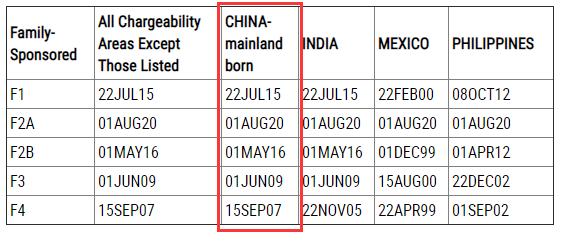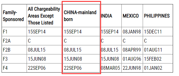 根据亲属移民排期表B,对于中国大陆出生的申请人来说: